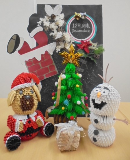 ブロック折り紙で作ったオラフ(アナと雪の女王より)、クリスマスツリー、くまのサンタはエレベータ前で可愛く出迎えてくれています。