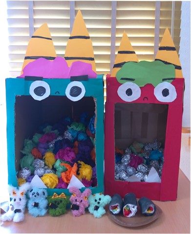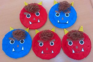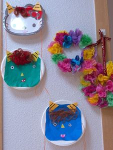 2月イベントの節分パーティーで使用する、豆まきゲームやビンゴゲームの工作を、みなさんで制作しました。お花紙やアルミホイルを丸めて豆を作り、鬼に向かって豆まきの練習をしています。