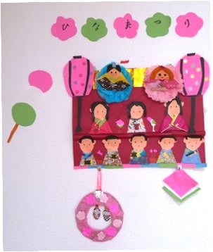 桃の花の飾りには、「ひなまつり」と書いていただきました。