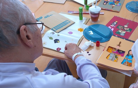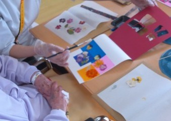 園芸療法では、押し花を作り2週間乾燥させたものを使って雛人形の着物に飾り付けしました。